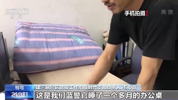 建三居民區防疫工作組臨時黨支部負責人 韋心磊:這是我們藍警官睡了一個多月的辦公桌,中間還不是很平整。有時候我們送點物資到居民家中,居民會給我們深深鞠一躬,那時候感動還是非常非常大的。
