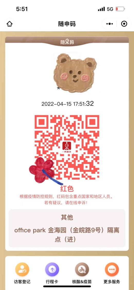 4月15日上午,核酸結(jié)果一出,三個紅碼,“它”來了!千防萬防,“它”還是來了。娃卻格外期待及雀躍,不停問我:“真的可以去方艙了嗎?能見外婆了嗎?我迫不及待了呢!”