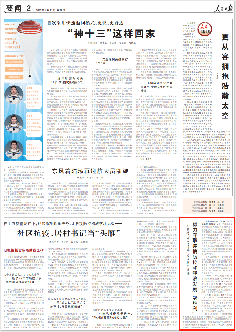 眼下,在落實好各項防控措施的基礎上,山東正全力有序做好項目開工建設、企業生產經營,持續恢復正常生產生活秩序。“當前全省疫情防控形勢持續穩定向好,出現零星疫情不可怕,只要堅持“動態清零”總方針不猶豫不動搖,把各項常態化疫情防控措施和機制落到實處,就有能力和信心守住疫情不出現規模性反彈的底線。針尖大的窟窿能漏過斗大的風,必須慎終如始、精準精細,一手抓疫情防控不放松,一手抓經濟發展不動搖,堅決守住來之不易的防控成果。”山東省委主要負責同志說。(記者徐錦庚、侯琳良)