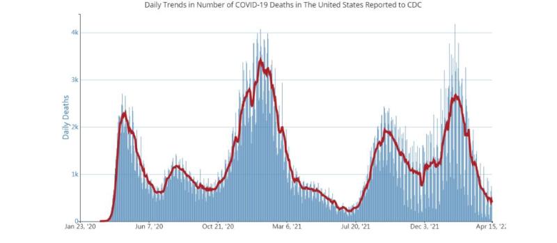 這是美國(guó)疾病控制和預(yù)防中心2022年4月16日公布的美國(guó)日增新冠死亡病例趨勢(shì)圖。(圖片來源:美國(guó)疾病控制和預(yù)防中心網(wǎng)站)