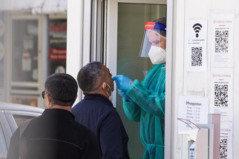 2022年3月24日,在德國(guó)首都柏林,一名新冠病毒檢測(cè)站的工作人員為一名男子檢測(cè)。(新華社發(fā))