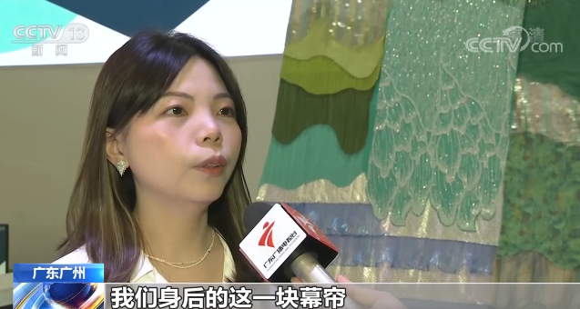 參展企業研發中心設計師 黃雨桐:我們身后這一塊幕簾,是通過我們日常生產的邊角料,一針一線來組成的,黃色代表大地,綠色代表植被,藍色代表大海。