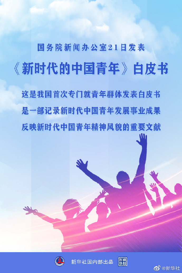 國務(wù)院新聞辦公室4月21日發(fā)表《新時代的中國青年》白皮書。這是我國首次專門就青年群體發(fā)表白皮書。白皮書全面介紹了新時代黨和政府為青年發(fā)展創(chuàng)造的良好條件、取得的巨大成就,充分展現(xiàn)了新時代中國青年奮進新征程、建功新時代的青春擔當,是一部記錄新時代中國青年發(fā)展事業(yè)成果、反映新時代中國青年精神風貌的重要文獻。(記者黃玥、董博婷、張研,海報設(shè)計喬昕)