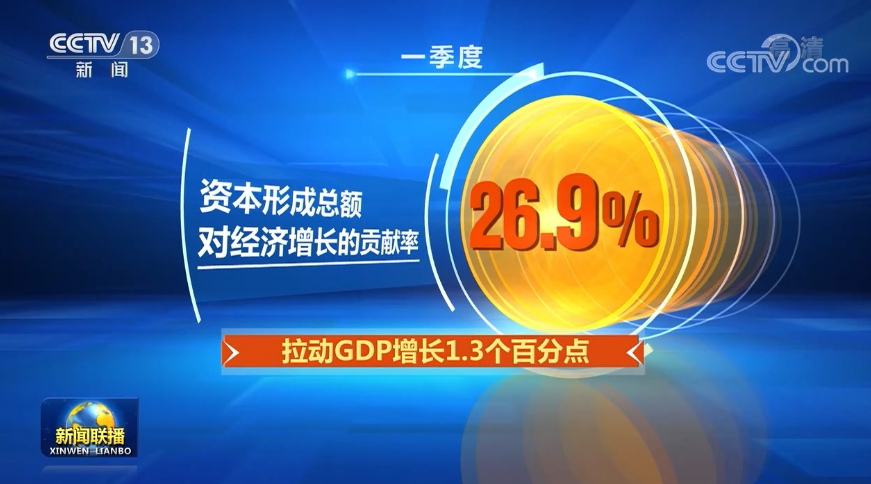 瞄準重大工程、重點領域,一季度,全國固定資產投資規模不斷擴大,投資拉動經濟的增長作用提升。一季度,資本形成總額對經濟增長的貢獻率為26.9%,拉動GDP增長1.3個百分點。