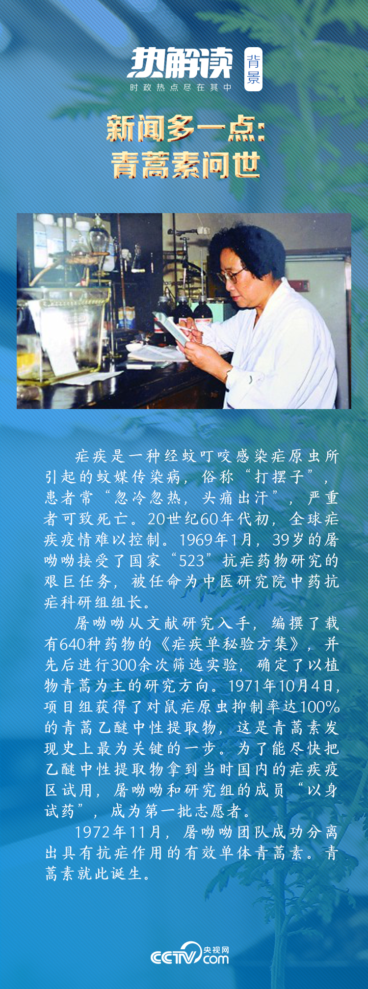 2015年10月,屠呦呦因“從中醫藥古典文獻中獲取靈感,先驅性地發現青蒿素,開創瘧疾治療新方法”,獲得諾貝爾生理學或醫學獎。