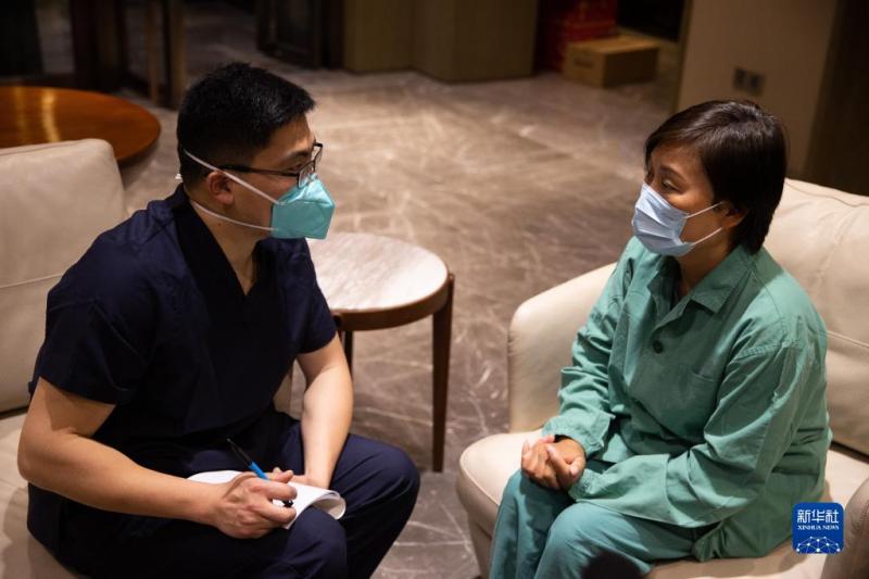 4月28日,在上海浦東北蔡鎮一家酒店,下午抵達的杭州口腔醫院援滬醫療隊領隊潘凌峰(左)和東方醫院南院北蔡采樣復核工作領隊周如女在交流第二天的工作安排。