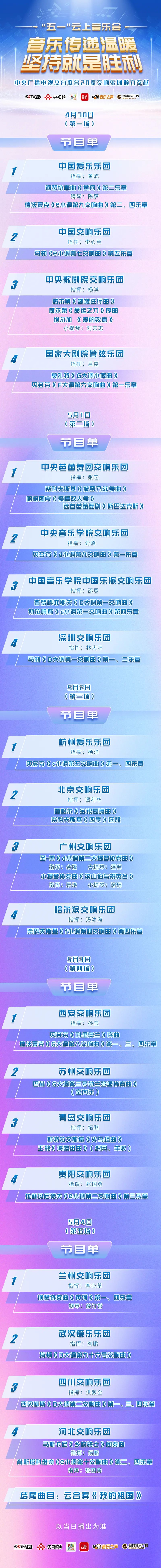 音樂會(huì)將于4月30日至5月4日,每天20點(diǎn)在央視頻、央視文藝、云聽客戶端上線,每天21點(diǎn)40分在央視音樂頻道播出。5月1日至5月5日晚間,在央廣音樂之聲、經(jīng)典音樂廣播頻率播出。