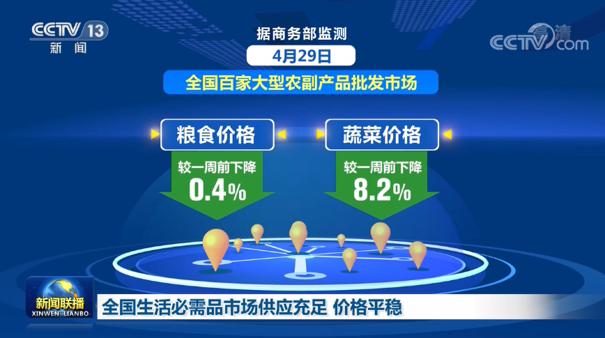 央視網(wǎng)消息(新聞聯(lián)播):“五一”假日臨近,商務(wù)部監(jiān)測(cè)顯示,目前,全國(guó)生活必需品市場(chǎng)供應(yīng)充足、價(jià)格平穩(wěn)。