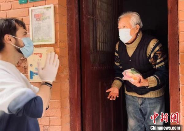 俄羅斯小伙兒matveev(中)在給社區(qū)里的老年人派發(fā)俄羅斯甜點(diǎn)小禮包 受訪者 供圖