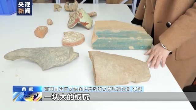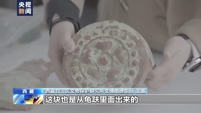 西藏自治區文物保護研究所文博助理館員 張娜:這個瓦當的話是挖掘出來最完整的一個,這一塊也是從龜趺里面出來的一塊大的板瓦,這是我們這次出土最大的板瓦。