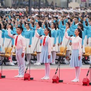 2021年7月1日上午,慶祝中國共產黨成立100周年大會在北京天安門廣場隆重舉行。這是共青團員和少先隊員代表集體致獻詞。新華社記者 陳曄華 攝