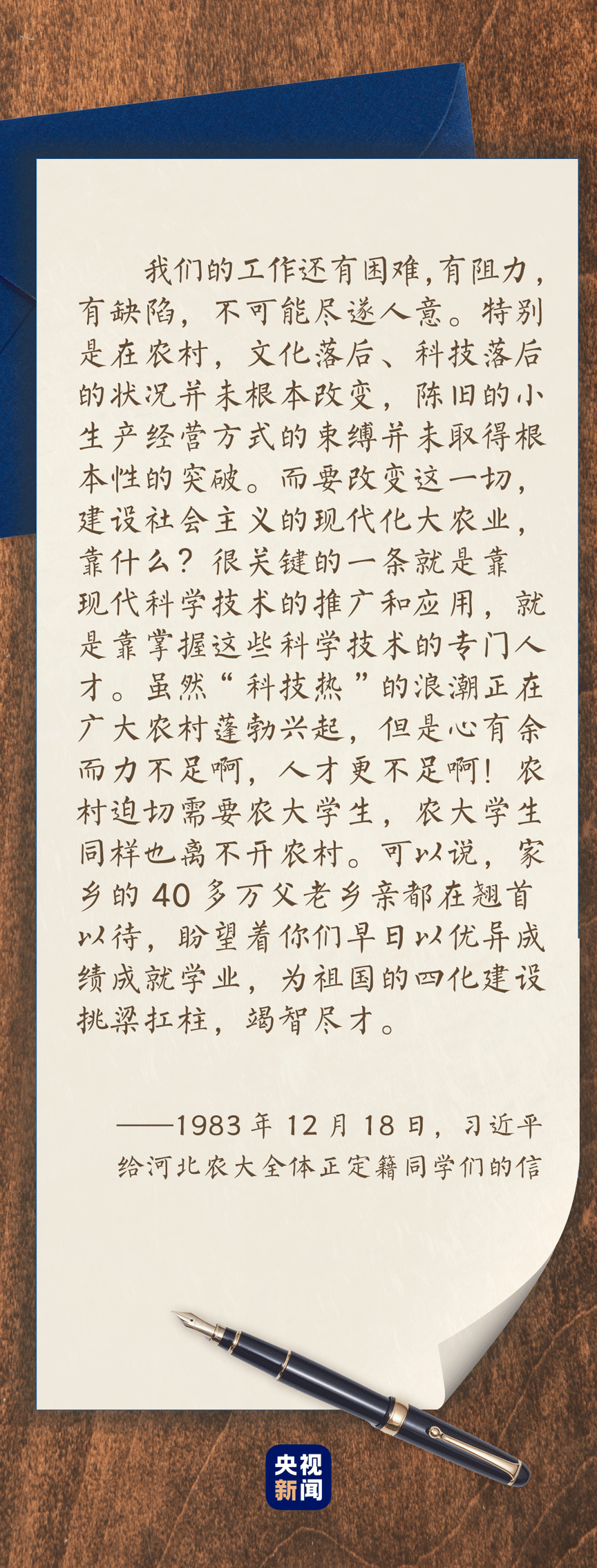 “習書記的來信有兩點對我們觸動很大。一是習書記非常謙虛,信里說‘過去對你們一直關心未及,深感抱歉,望得到諒解’‘這里我想高興地向大家報告’,特別是信的末尾署名是‘你們的同志習近平’,一下子就拉近了我們之間的距離,現在回憶起來仍然對這個落款印象深刻。二是習書記在信中說‘農村迫切需要農大學生’‘家鄉的40多萬父老鄉親都在翹首以待’,讓我們感受到‘挑梁扛柱’的責任,增添了‘奮發圖強’的力量,激發了‘獻身四化’的決心!