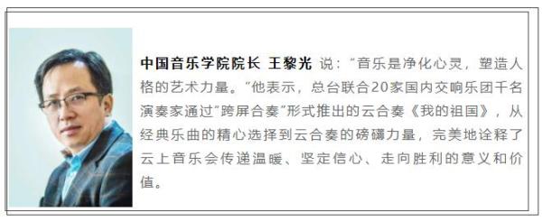 4月30日至5月4日,中央廣播電視總臺聯合中國交響樂團、中國愛樂樂團、國家大劇院管弦樂團、中央歌劇院交響樂團、中央芭蕾舞團交響樂團、中央音樂學院交響樂團、中國音樂學院中國樂派交響樂團、北京交響樂團、深圳交響樂團、杭州愛樂樂團、廣州交響樂團、青島交響樂團、哈爾濱交響樂團、蘇州交響樂團、西安交響樂團、武漢愛樂樂團、蘭州交響樂團、河北交響樂團、貴陽交響樂團、四川交響樂團等20家交響樂團,連續五天每天晚間推出一場《音樂傳遞溫暖,堅持就是勝利——“五一”云上音樂會》,并以“跨屏合奏”《我的祖國》的方式完美收官。
