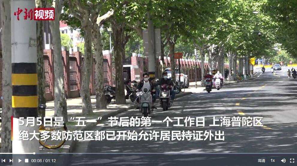 五一期間,上海宣布六個區社會面基本清零,其中唯一的中心城區便是普陀區。5月5日是五一節后第一個工作日,該區的絕大多數防范區都已經開始允許居民持證外出。記者在普陀區曹楊街道看到,路上已有許多行人,按照規定,市民可以限時限戶在所在街鎮內活動,并限時前往指定的超市、藥店。有市民告訴記者,出來走走感覺很舒服,盼上海早日解封。(記者 溫孟馨 制作 徐妙巧)
