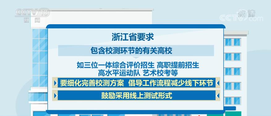 浙江省要求各地各校提前制定突發疫情應急預案,做到“一類一方案”“一生一方案”。按要求為每個考點配備防疫副主考,設置具備防護隔離措施的特殊通道和專用隔離考場。包含校測環節的有關高校,如三位一體綜合評價招生、高職提前招生、高水平運動隊、藝術校考等,要細化完善校測方案,倡導工作流程減少線下環節,鼓勵采用線上測試形式。