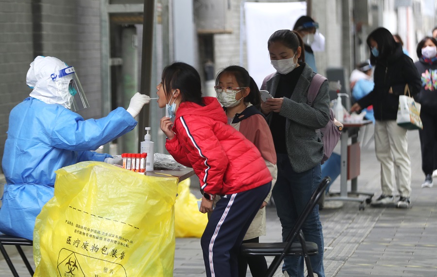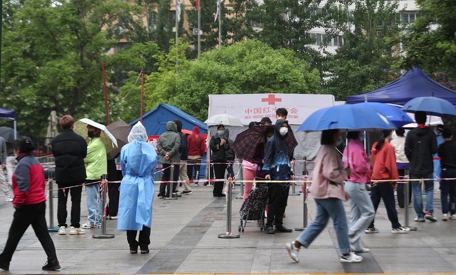 5月8日,北京市東城區景山東街核酸檢測點,居民排隊進行核酸采樣。中國日報記者 鄒紅 攝