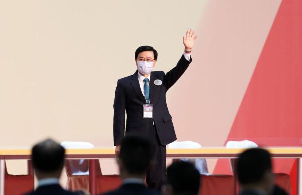 5月8日,在香港會(huì)議展覽中心,李家超揮手致意。(新華社記者李鋼攝)