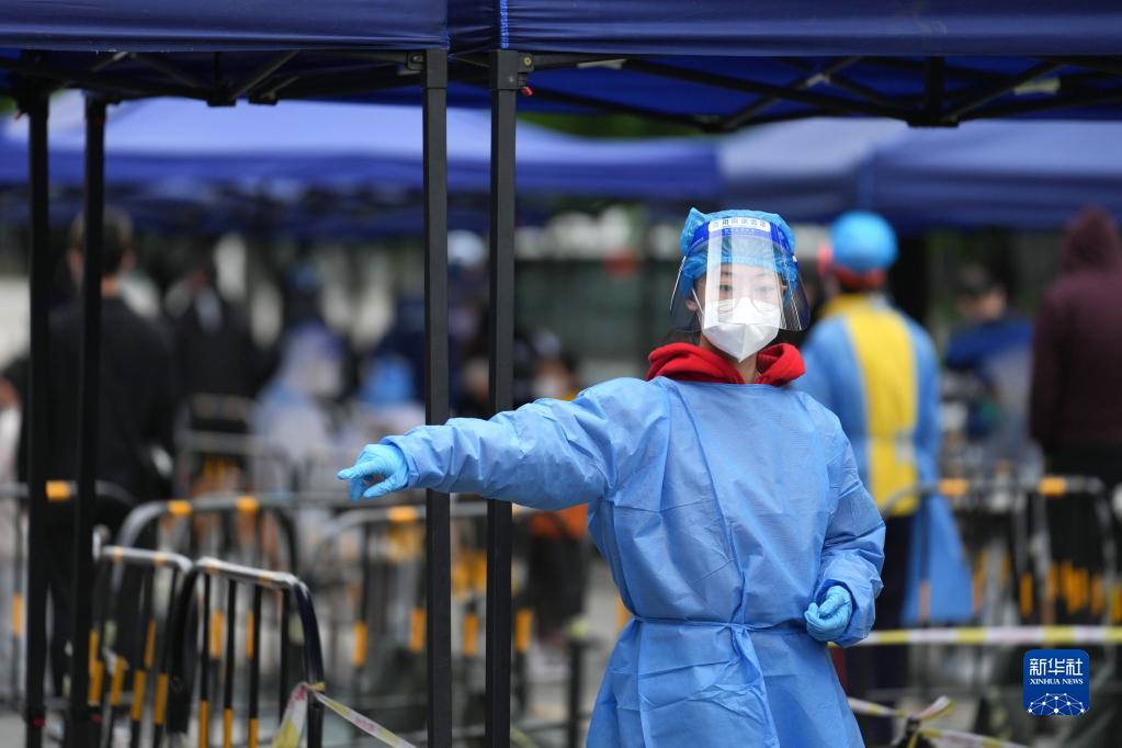 在北京市朝陽(yáng)區(qū)八里莊街道一處核酸檢測(cè)點(diǎn),來(lái)自北京一家傳媒文化有限公司的志愿者張書(shū)琪在引導(dǎo)參加核酸檢測(cè)的人員有序排隊(duì)(5月8日攝)。張書(shū)琪今年25歲,這是她第一次參加疫情防控志愿工作。
