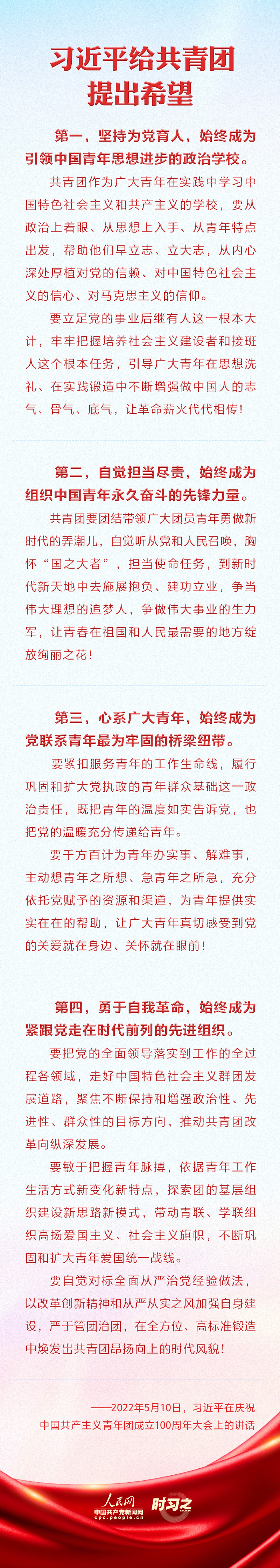 5月10日上午,慶祝中國(guó)共產(chǎn)主義青年團(tuán)成立100周年大會(huì)在北京人民大會(huì)堂隆重舉行。中共中央總書記、國(guó)家主席、中央軍委主席習(xí)近平出席大會(huì)并發(fā)表重要講話。講話中,習(xí)近平總書記給共青團(tuán)、廣大共青團(tuán)員、廣大團(tuán)干部提出了希望。