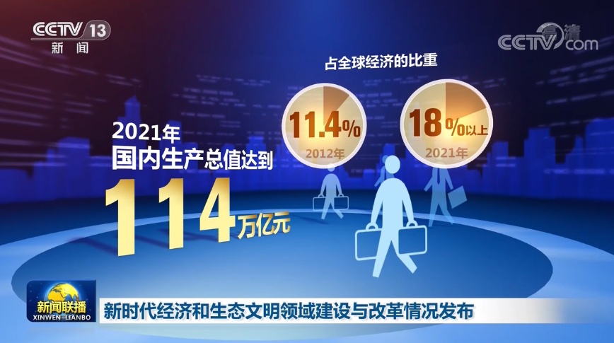 這十年,我國經濟實力又邁上一個大臺階。2021年國內生產總值達到114萬億元,占全球經濟的比重由2012年的11.4%上升到18%以上,世界第二大經濟體的地位得到鞏固提升。