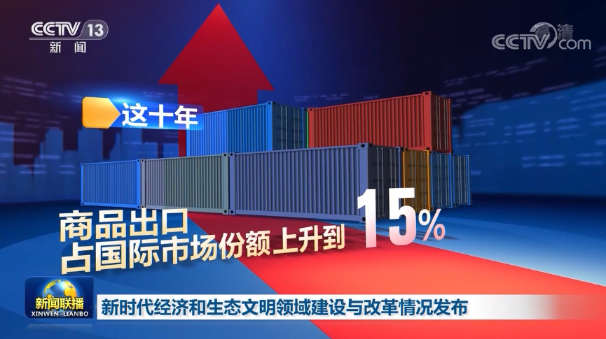 全方位、高水平對外開放新格局形成。商品出口占國際市場份額由11%上升到15%,貨物貿易第一大國地位得到增強,部署建設21個自貿試驗區和海南自由貿易港。