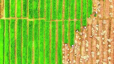 崇左市扶綏縣岜盆鄉(xiāng)岜倫村農(nóng)民在早稻育秧田里起秧苗。盧文斐攝/光明圖片