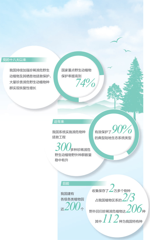 近年來,我國系統實施瀕危物種拯救工程,采取就地保護、遷地保護、放歸(回歸)自然、人工繁育(培植)等措施,有效保護了90%的典型陸地生態系統類型,300多種珍稀瀕危野生動植物野外種群數量穩中有升。目前,我國建有各級各類植物園近200個,收集保存了2萬多個物種,占我國植物區系的2/3。野外回歸珍稀瀕危植物達到206種,其中112種為我國特有種。麋鹿、普氏野馬曾一度在野外消失,目前通過人工繁育等方式,總數分別達近1萬只和700只左右,并成功實施放歸自然,重新建立了野外種群,生存區域和范圍不斷擴大。