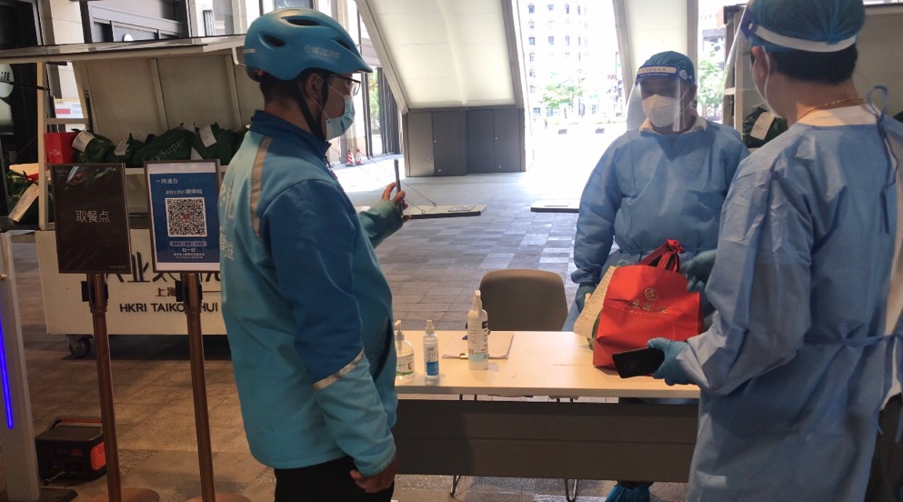 5月21日,在興業(yè)太古匯室外,外賣(mài)小哥向工作人員出示“場(chǎng)所碼”的掃碼結(jié)果后領(lǐng)取貨物。新華社記者 周蕊 攝