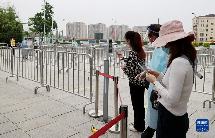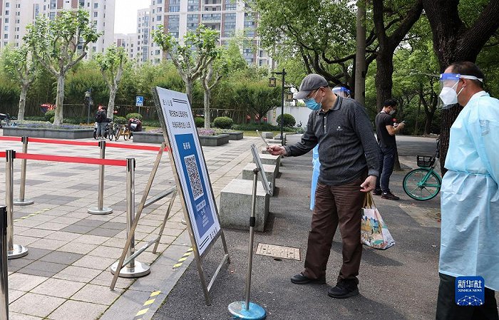 5月27日,在位于上海市閔行區的莘莊梅園外,市民在入園前使用手機掃描公園場所碼。