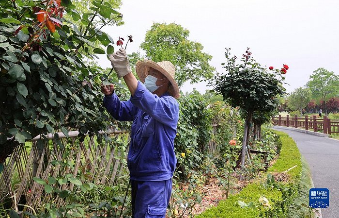 5月27日,在位于上海市閔行區的莘莊梅園內,園林工人在修剪花枝。