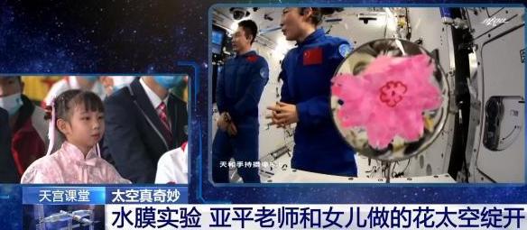 “天宮課堂”授課時(shí),王亞平將她和女兒在地球上一起制作的花朵折紙放進(jìn)水膜,讓女兒親手做的花朵折紙?jiān)谔铡熬`放”。