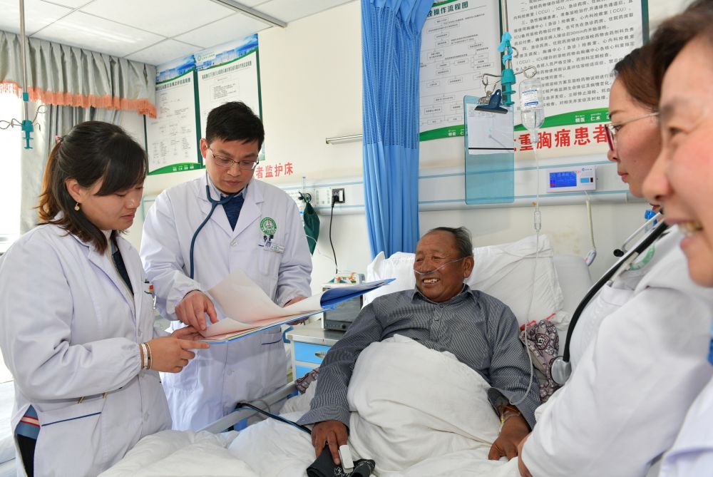 在西藏山南市人民醫(yī)院,來自安徽的援藏醫(yī)生梁有峰(左二)帶領(lǐng)醫(yī)生們查房!敖M團(tuán)式”醫(yī)療援藏提升了山南市醫(yī)療水平(2019年4月24日攝)。