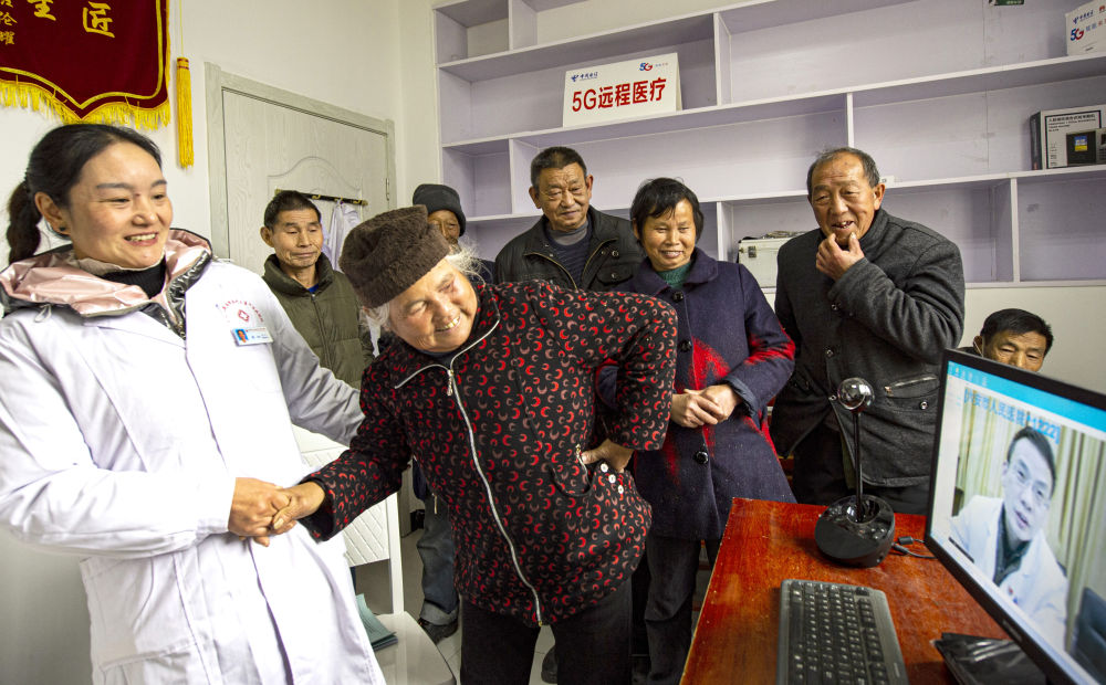 安徽金寨縣大灣村村民方臨芳(前右)指著自己身體疼痛的部位,在村醫(yī)袁玲(前左)的幫助下向通過5G網(wǎng)絡(luò)遠(yuǎn)程醫(yī)療會(huì)診的專家講述病情!盎ヂ(lián)網(wǎng)+醫(yī)療”讓村民在“家門口”也能享受專家診療(2020年12月3日攝)。