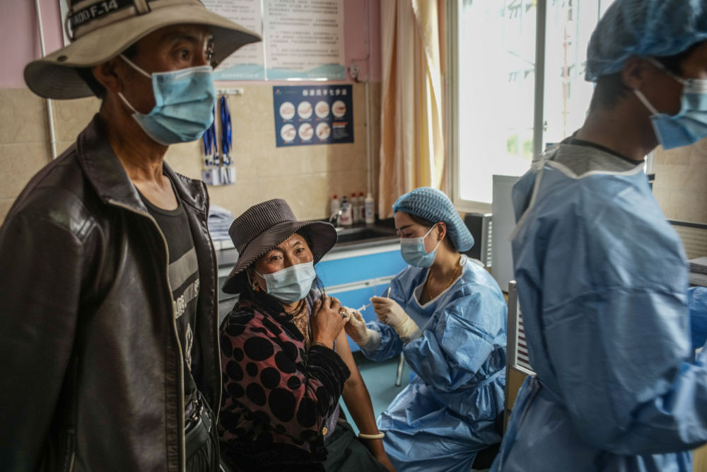 在四川甘孜州稻城縣疫苗接種點(diǎn),當(dāng)?shù)厝罕娫诮臃N新冠病毒疫苗。這批疫苗經(jīng)過三天冷鏈運(yùn)輸,從北京送到2000多公里以外的稻城,保證當(dāng)?shù)厝罕娊臃N(2021年7月24日攝)。