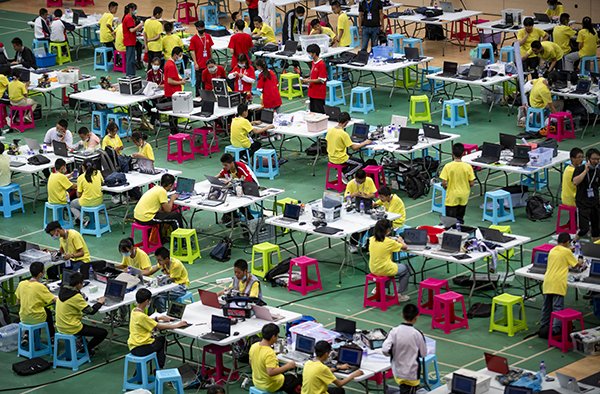 5月29日,第35屆云南省青少年科技創新大賽舉行。圖為參賽學生在比賽待賽區調試機器人。
