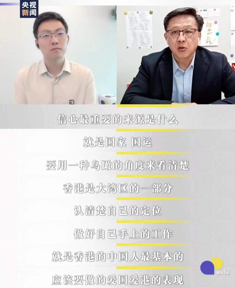 何君堯:這是一個(gè)過(guò)程,香港也要靠我們的年輕人走向未來(lái)。對(duì)于未來(lái)的新一代,我們要抓好國(guó)民教育、國(guó)家安全教育、世界觀教育等等。從哪里跌倒的,就要從哪個(gè)地方爬起來(lái)。今天的香港,就像一只火鳳凰,在烈火當(dāng)中,涅槃重生。