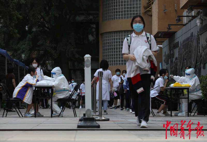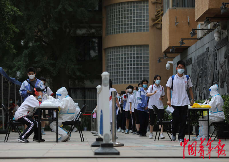 6月8日,北京市朝陽區陳經綸中學高考考點,考生們在結束下午英語科目的考試后,接受核酸檢測采樣。中青報 中青網記者 陳劍/攝