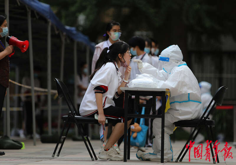 6月8日,北京市朝陽區陳經綸中學高考考點,在結束下午英語科目的考試后,一位考生在接受核酸檢測采樣。中青報 中青網記者 陳劍/攝