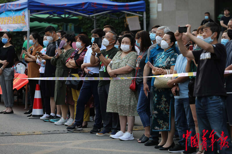 6月8日,北京市朝陽區陳經綸中學高考考點外,家長們等待考生走出學校。中青報 中青網記者 陳劍/攝