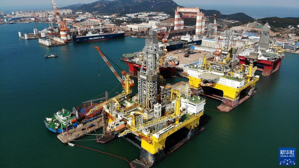 “藍鯨1號”(前右)及姊妹平臺“藍鯨2號”(前左)在其生產基地中集來福士海洋工程有限公司煙臺基地進行維護和保養(2021年10月18日攝,無人機照片)。新華社記者李紫恒攝