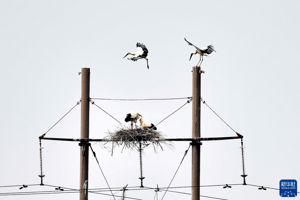 這是山東黃河三角洲國家級自然保護區電線桿上的東方白鸛的巢(2021年5月13日攝)。新華社記者郭緒雷攝