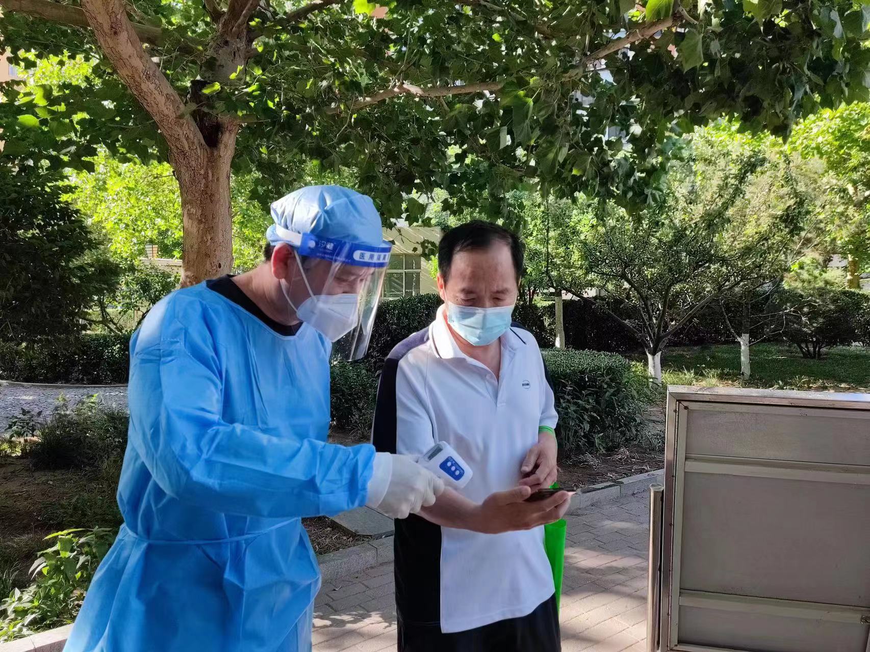楊志強(qiáng)為社區(qū)居民測體溫