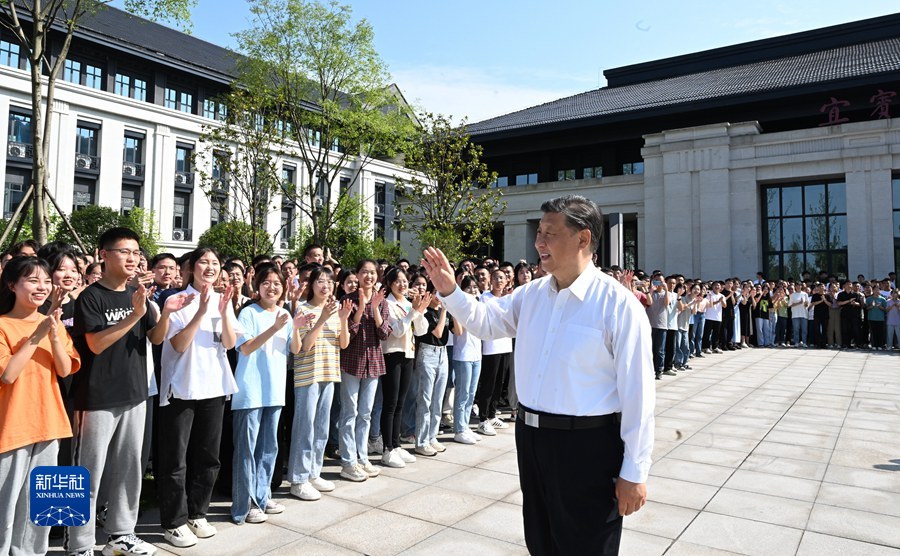 6月8日,中共中央總書記、國家主席、中央軍委主席習近平在四川考察。這是8日下午,習近平在宜賓學院考察時,向師生們揮手致意。新華社記者 李學仁 攝