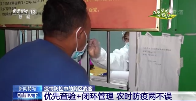 晚上10點(diǎn)多,來自黑龍江佳木斯的機(jī)手孔德寶和老鄉(xiāng)田佰良,在完成信陽息縣的收割后,拉著兩臺(tái)收割機(jī)趕到了上蔡縣,要按一位用戶發(fā)來的定位去往麥?zhǔn)盏攸c(diǎn)。駐馬店上蔡縣是河南的種糧大縣,小麥種植面積146萬畝。6月1日前后,上蔡縣的小麥進(jìn)入大面積的收割時(shí)段,3000多臺(tái)跨區(qū)作業(yè)的收割機(jī)云集上蔡參加搶收。持有跨區(qū)作業(yè)證的孔德寶和老鄉(xiāng)田佰良,在農(nóng)機(jī)轉(zhuǎn)運(yùn)綠色通道服務(wù)站點(diǎn),接受免費(fèi)落地核酸檢測(cè)。