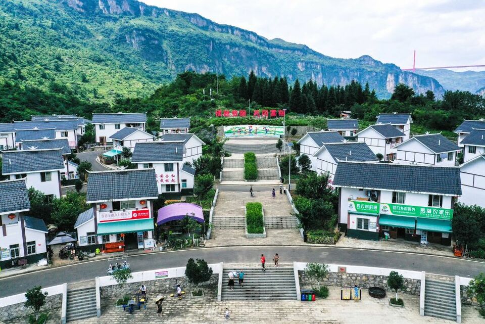 ↑2021年7月24日拍攝的貴州省黔西市新仁苗族鄉化屋村麻窩寨易地扶貧搬遷集中安置點一角(無人機照片)。