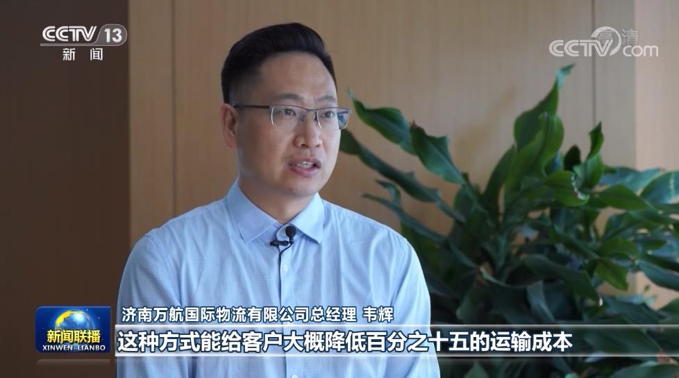 山東濟南萬航國際物流有限公司總經理 韋輝:這種方式呢,能給客戶大概降低15%的運輸成本,最快的方式大概能實現三個多周這么一個周期。
