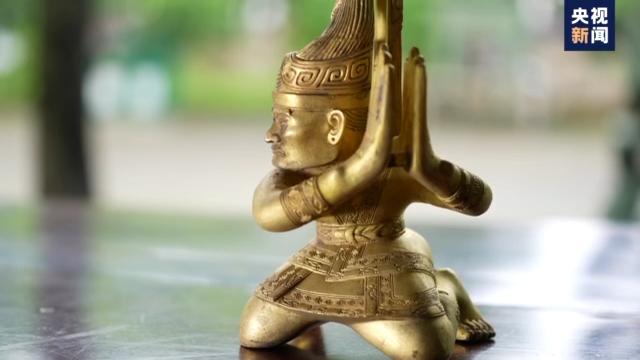失蠟法鑄造手工藝體驗者 賀枚陽:古蜀先民稱吉金,其實就是指金色,銅身綠袖鐵身紅袖,工匠他說你外面看到青色其實就是它的銹,其實它本來的顏色就是金色的。