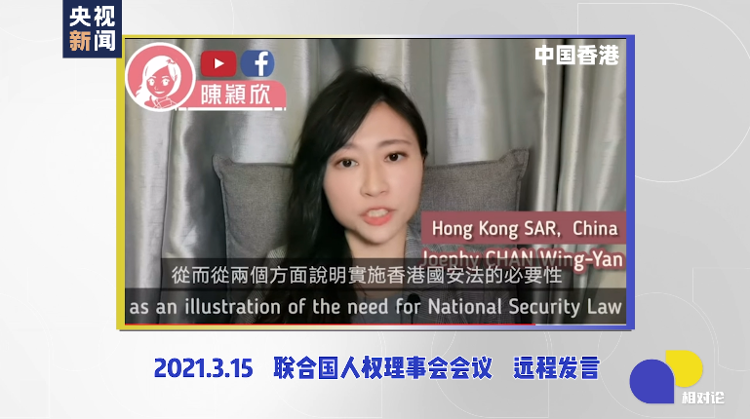 2021年3月15日,聯(lián)合國人權理事會會議——90秒,是陳穎欣的發(fā)言時間,主題是2020年6月30日落地生效的香港國安法。
