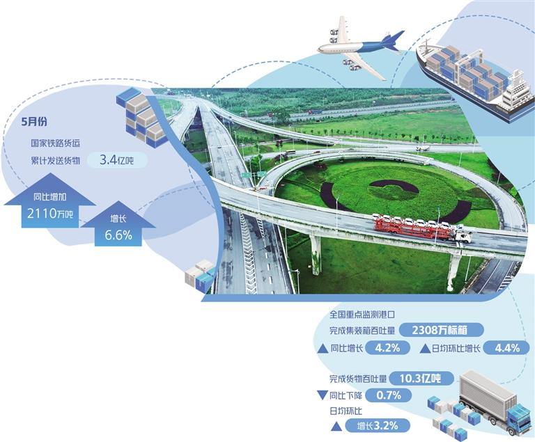 中國國家鐵路集團有限公司數據顯示,5月份,國家鐵路貨運保持強勁增長態勢,累計發送貨物3.4億噸,同比增加2110萬噸,增長6.6%,單月貨物發送量再創新高。