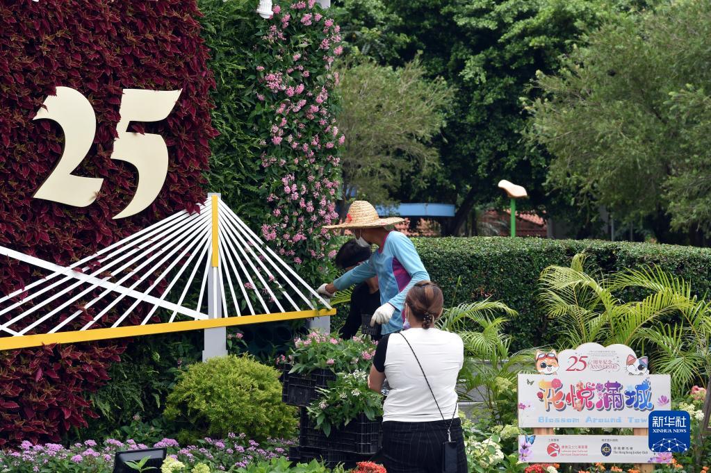 6月20日,工作人員在香港荃灣公園布置慶祝香港回歸祖國(guó)25周年花圃。